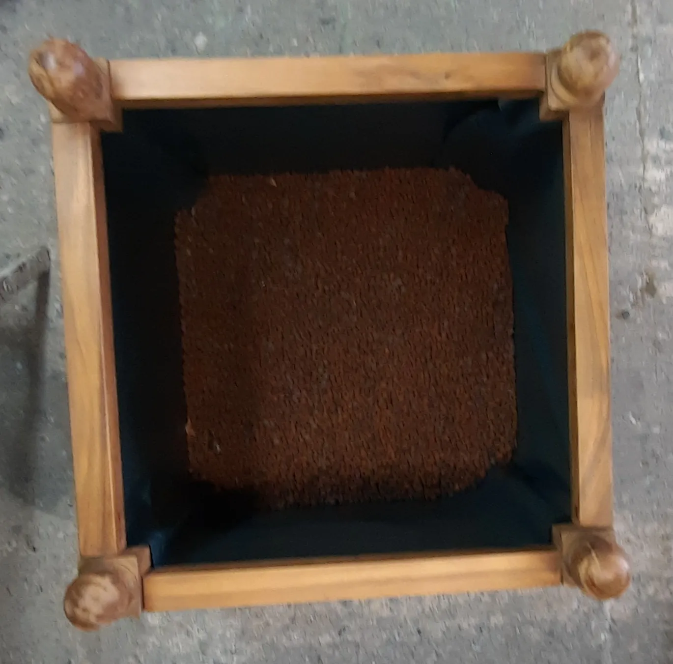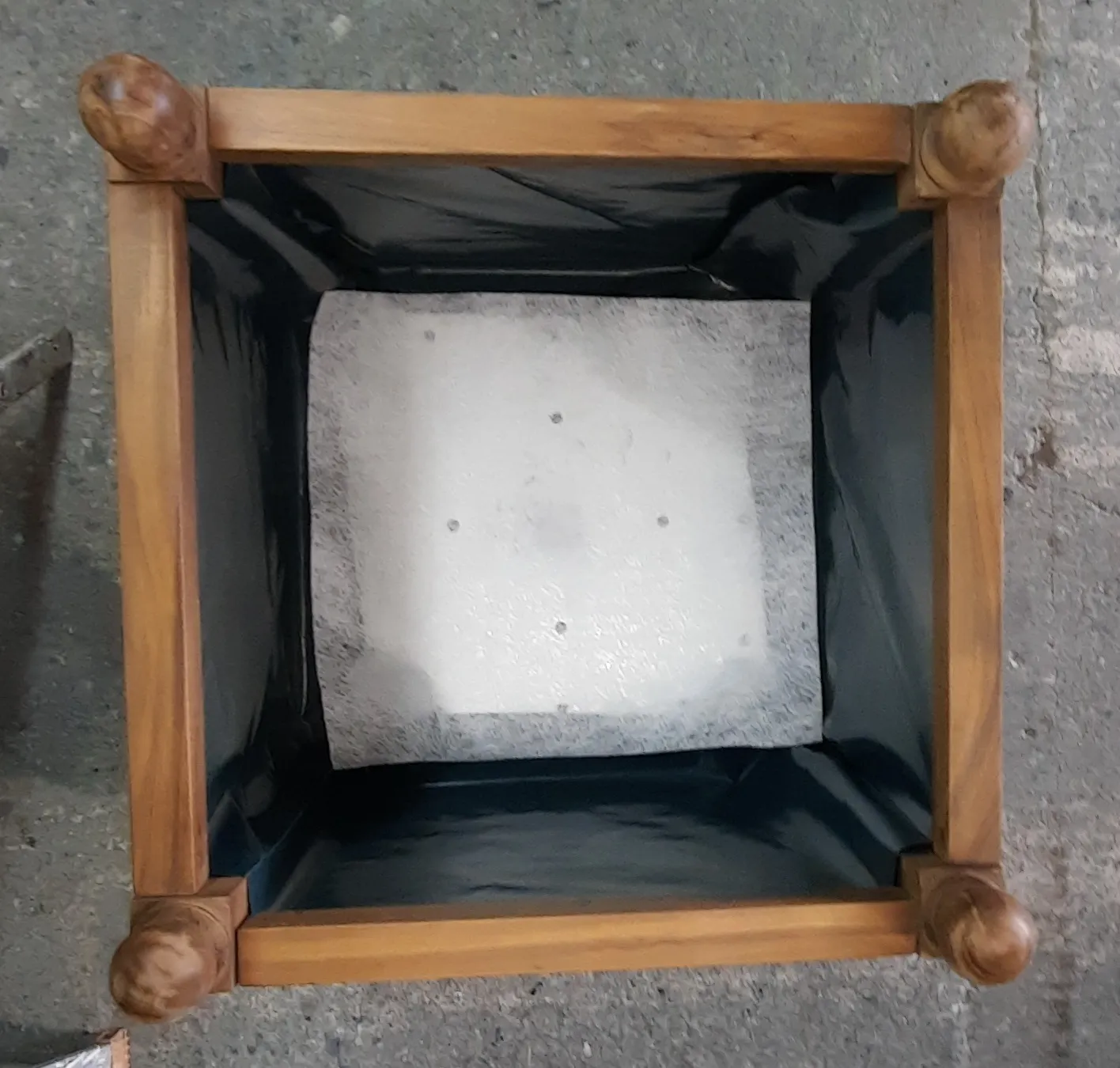 L’intérieur des bacs est protégé par une couche de goudron dilué et à fin que la terre ne soit pas en contact avec le bois, une feuille de polyane. Une feuille de géotextile est placée au fond du bac. Nous conseillons de placer à l’intérieur du bac une couche de 4 à 7 cm de billes d’argile à fin de faciliter le drainage. Vous pouvez ensuite ajouter la terre appropriée à votre plante.